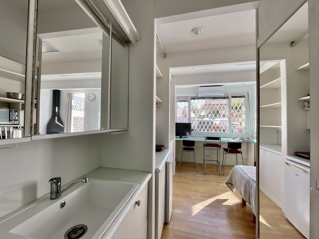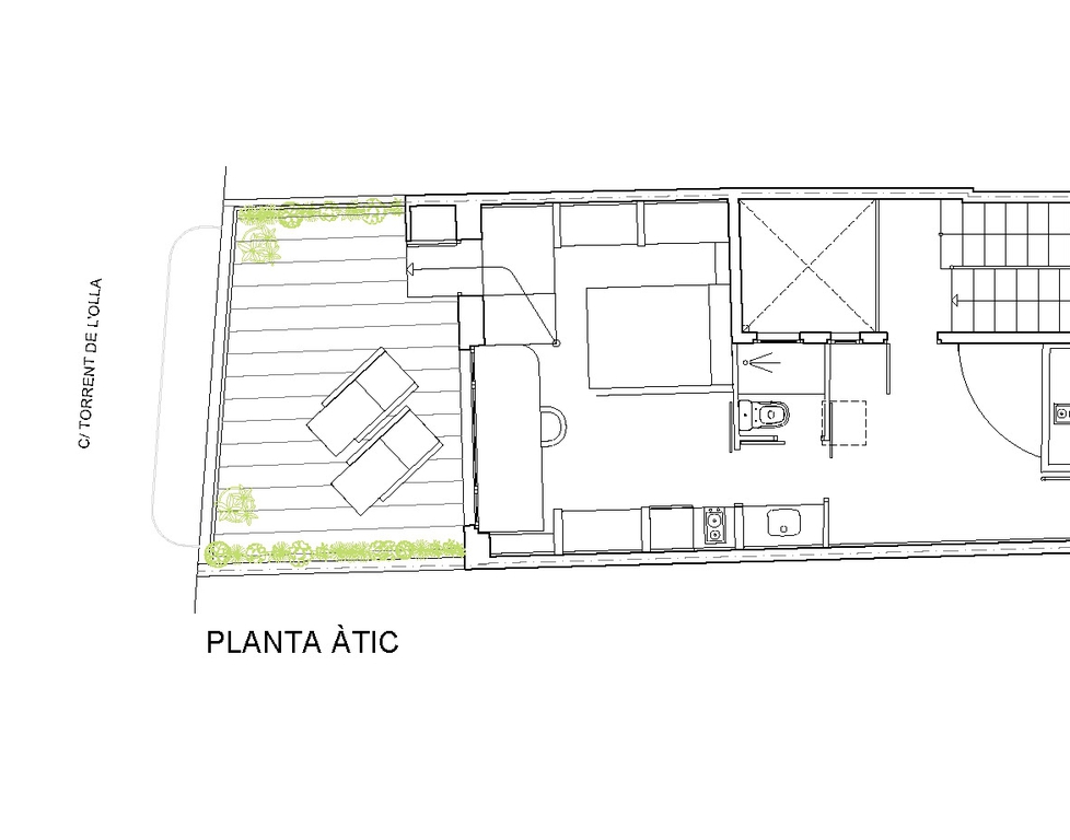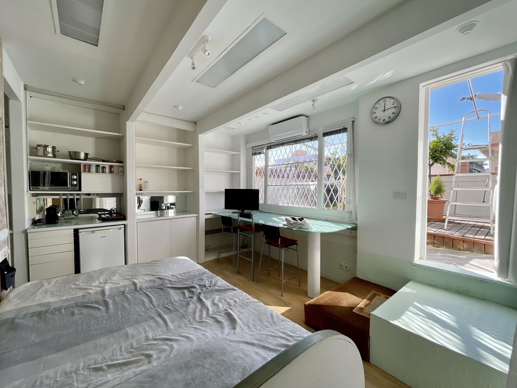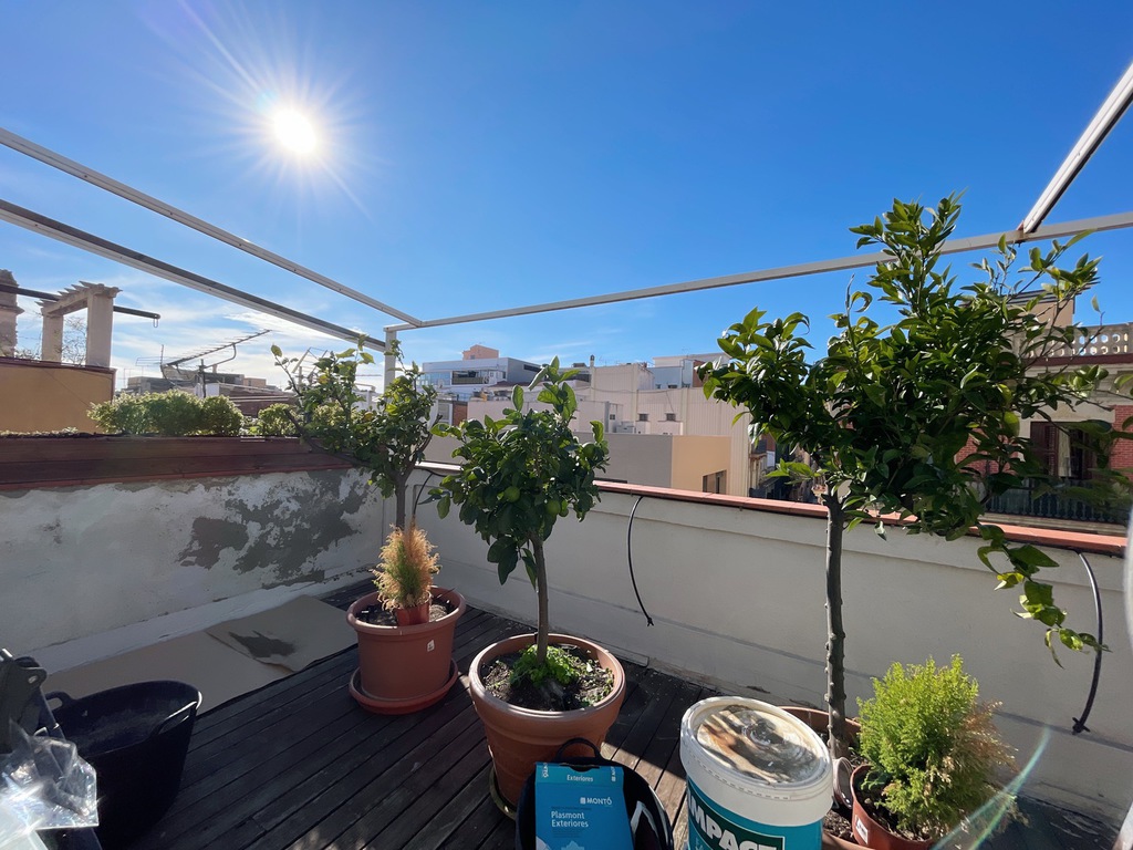 Bonito ático estilo Loft con terraza y con bonitas y soleadas vistas al barrio de Gracia en Barcelona. Este pequeño pero bonito loft se encuentra en un edificio de estilo modernista, sin ascensor. Se alquila para largo plazo. Los interesados deben tener en mente que es un espacio abierto, pequeño de unos 14m2. Dispone de una cocina pequeña baño y ducha separada. Es un estilo tipo habitación de hotel con tarraza espaciosa.
