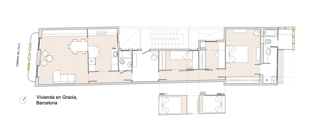 Bonito piso de tres dormitorios con terraza y con bonitas y soleadas vistas al barrio de Gracia en Barcelona. Esta propiedad se encuentra en un edificio de estilo modernista, sin ascensor. Se alquila para largo plazo.