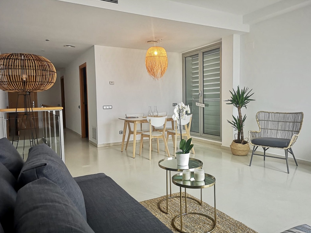 Al entrar en la planta superior, encontramos la sala de estar/salon, la cocina, y dos grandes terrazas con vista al mar.