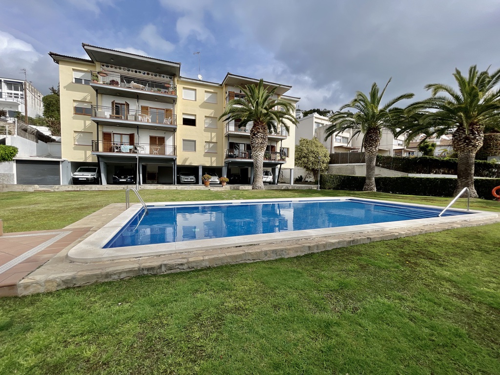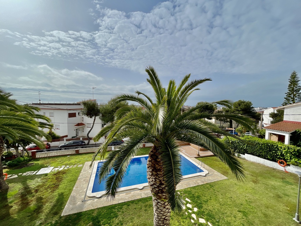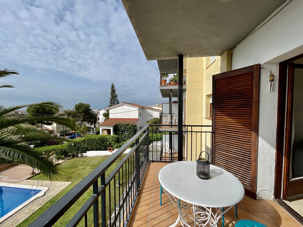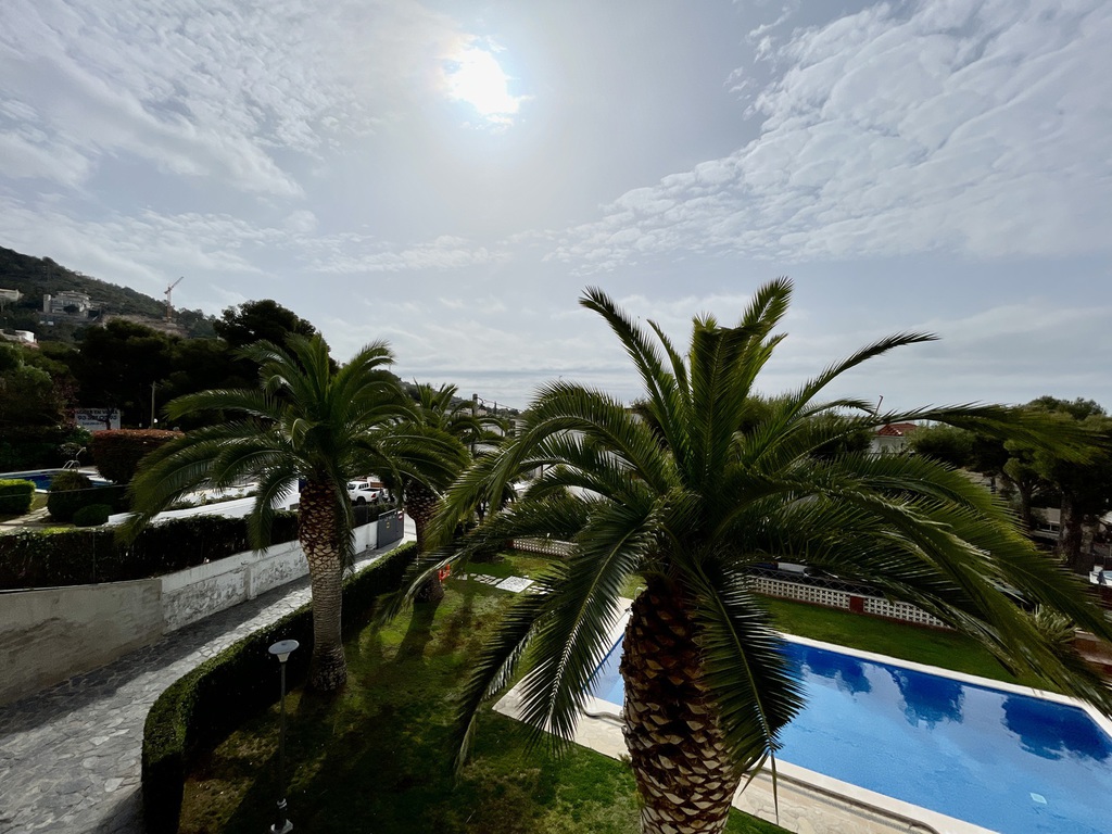 en la urbanización de la Levantina, Sitges, tenemos un acogedor y bonito apartamento muy soleado. Desde la terraza puedes disfrutar de unas vistas al mar, la piscina comunitaria y jardín mientras estás desayunando y haciendo el aperitivo.