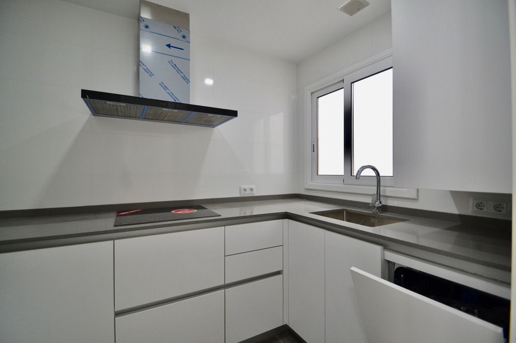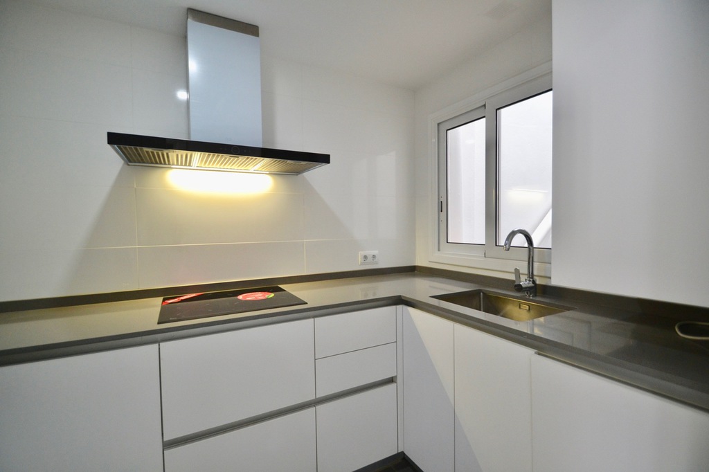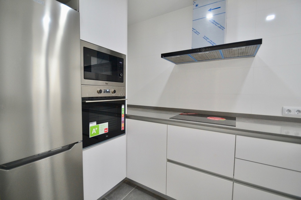 calle de punta a punta. La cocina está construida con muebles blancos y todos los electrodomésticos (lavavajillas, nevera, horno y micro) de la marca "Teka"