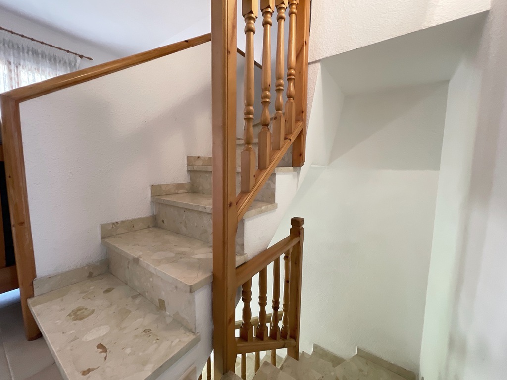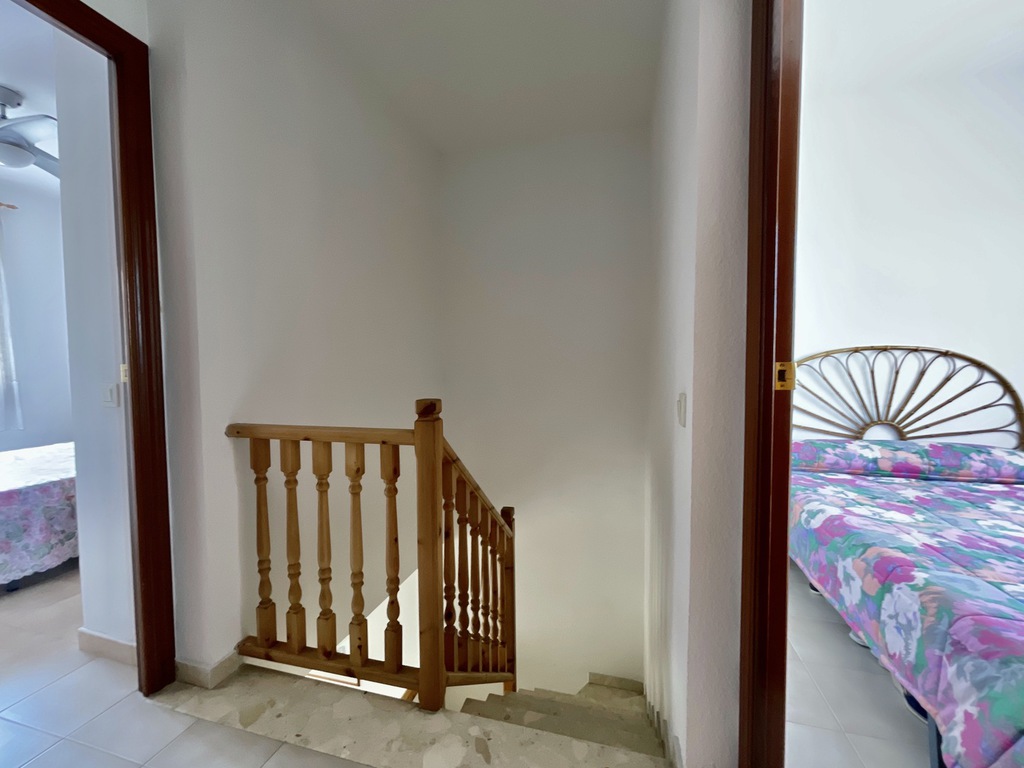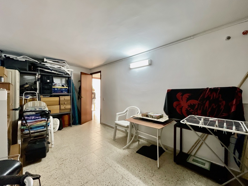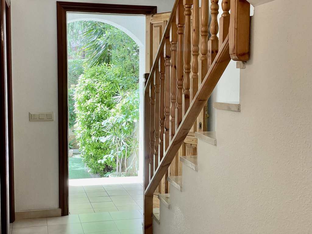 Entrando por la puerta principal, encontramos en la planta baja, el garaje privado cerrado con puerta metálica y con acceso directo a la vivienda, también hay un dormitorio y acceso al jardín. Subiendo a la primera planta nos lleva a la sala de estar y comedor gran terraza, cocina, lavadero y un cuarto de baño.