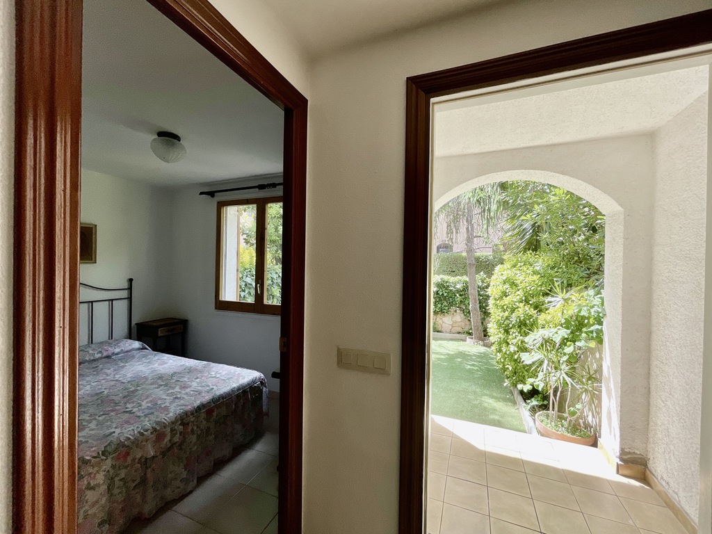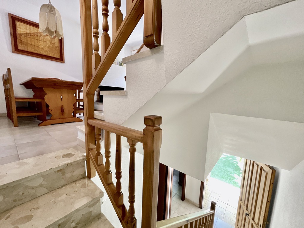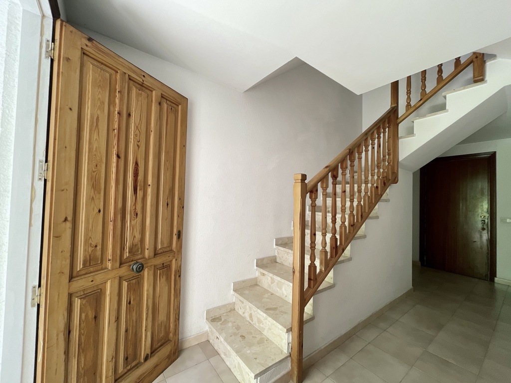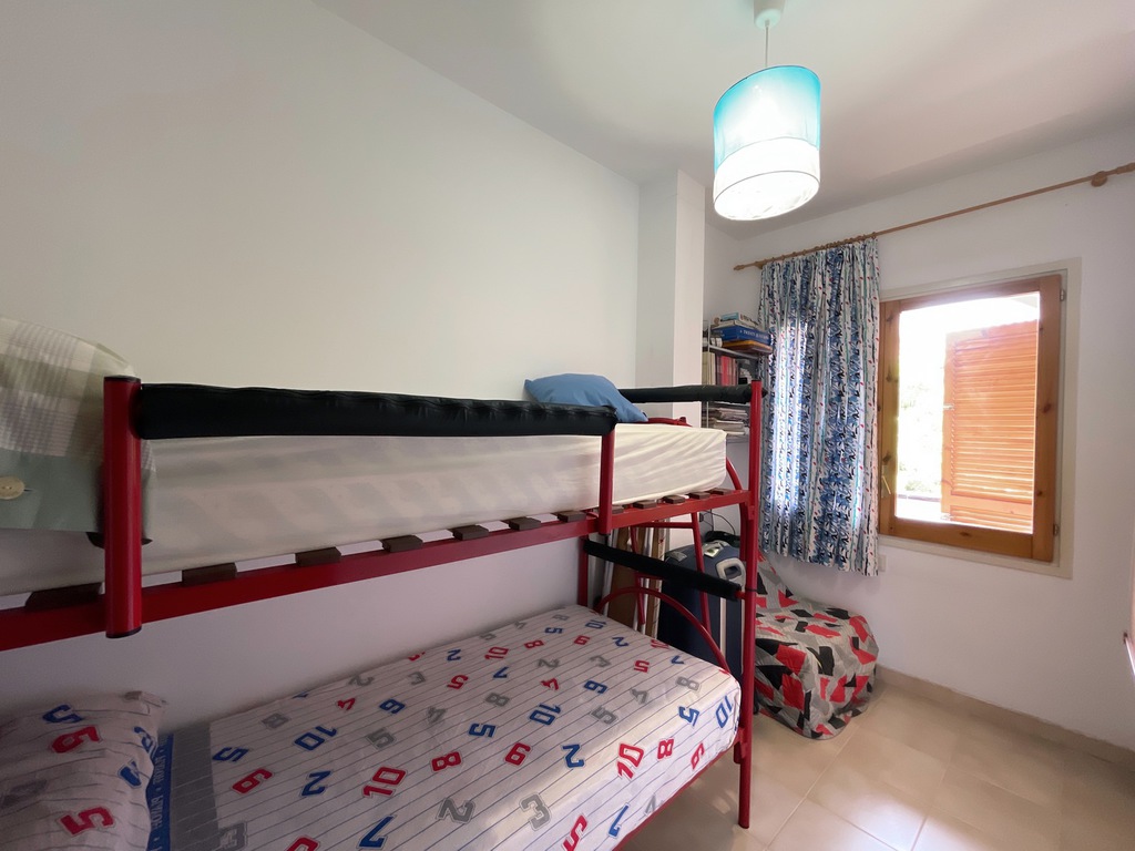 Entrando por la puerta principal, encontramos en la planta baja, el garaje privado cerrado con puerta metálica y con acceso directo a la vivienda, también hay un dormitorio y acceso al jardín. Subiendo a la primera planta nos lleva a la sala de estar y comedor gran terraza, cocina, lavadero y un cuarto de baño.