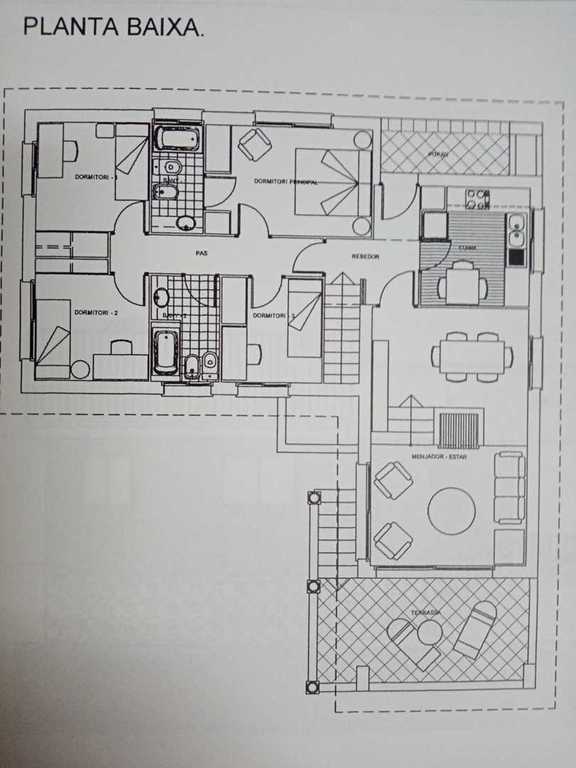La planta principal se accede a través de un amplio salón-comedor que se divide en dos ambientes: la sala de estar y la zona de comedor. Ambos espacios tienen acceso directo a una terraza con vistas a la montaña. La terraza cuenta con una zona ajardinada que alberga una gran piscina y una barbacoa, perfecta para disfrutar de encuentros al aire libre.