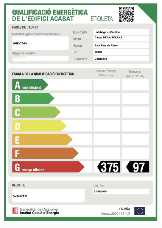 - Consumo: 375,56 kWh/m² año Emisiones: 97,12 kg CO2/m² año