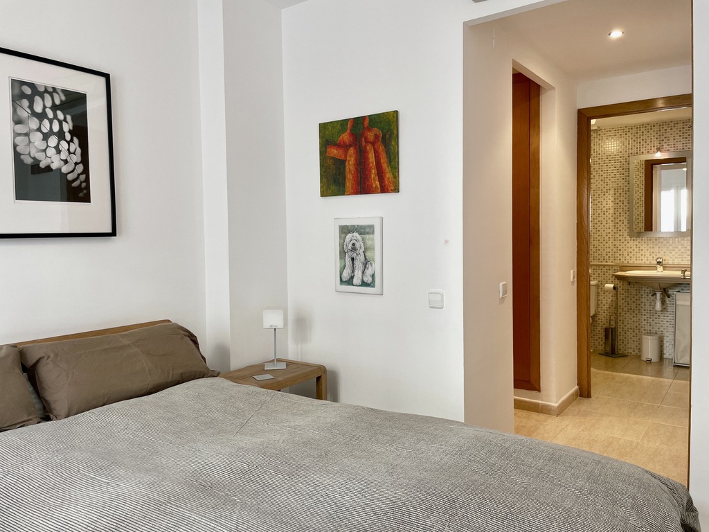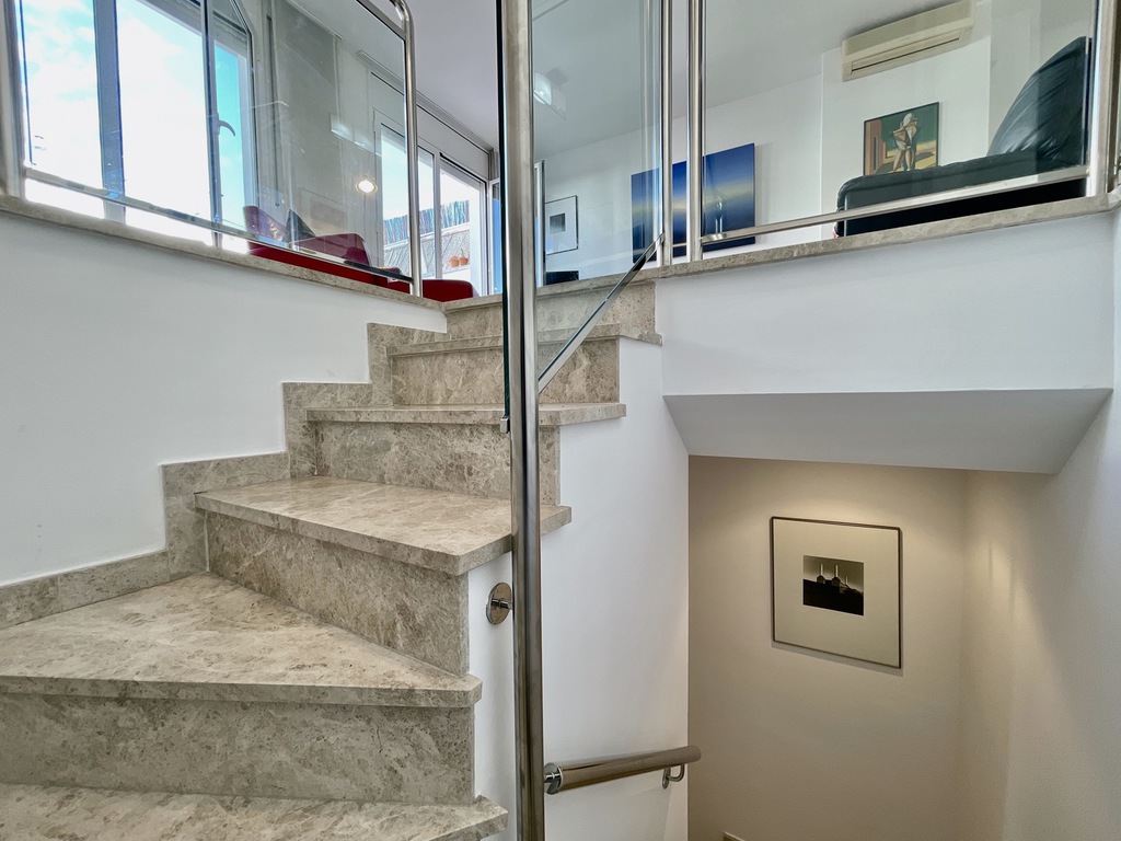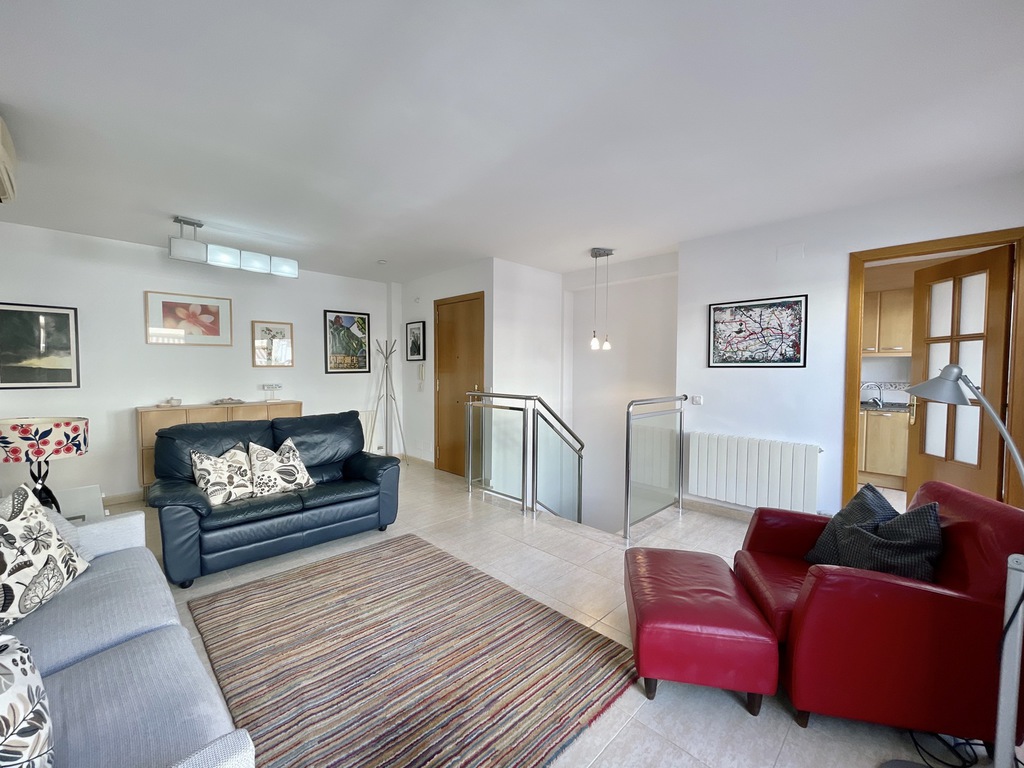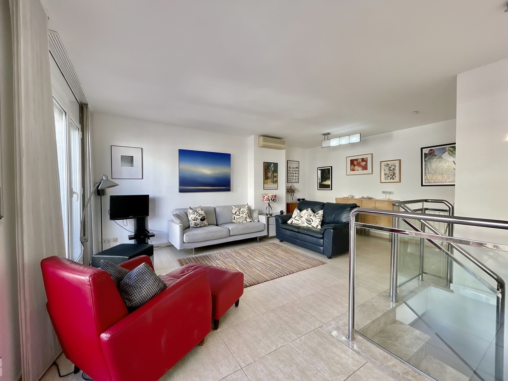 The property is divided over two floors, on entry we find a comfortable salon, kitchen and large windows giving access to the main 23m2 terrace, going down the stairs we enter the bed and bathroom area, two double bedrooms (one is ensuite), a single room and second bathroom with shower.