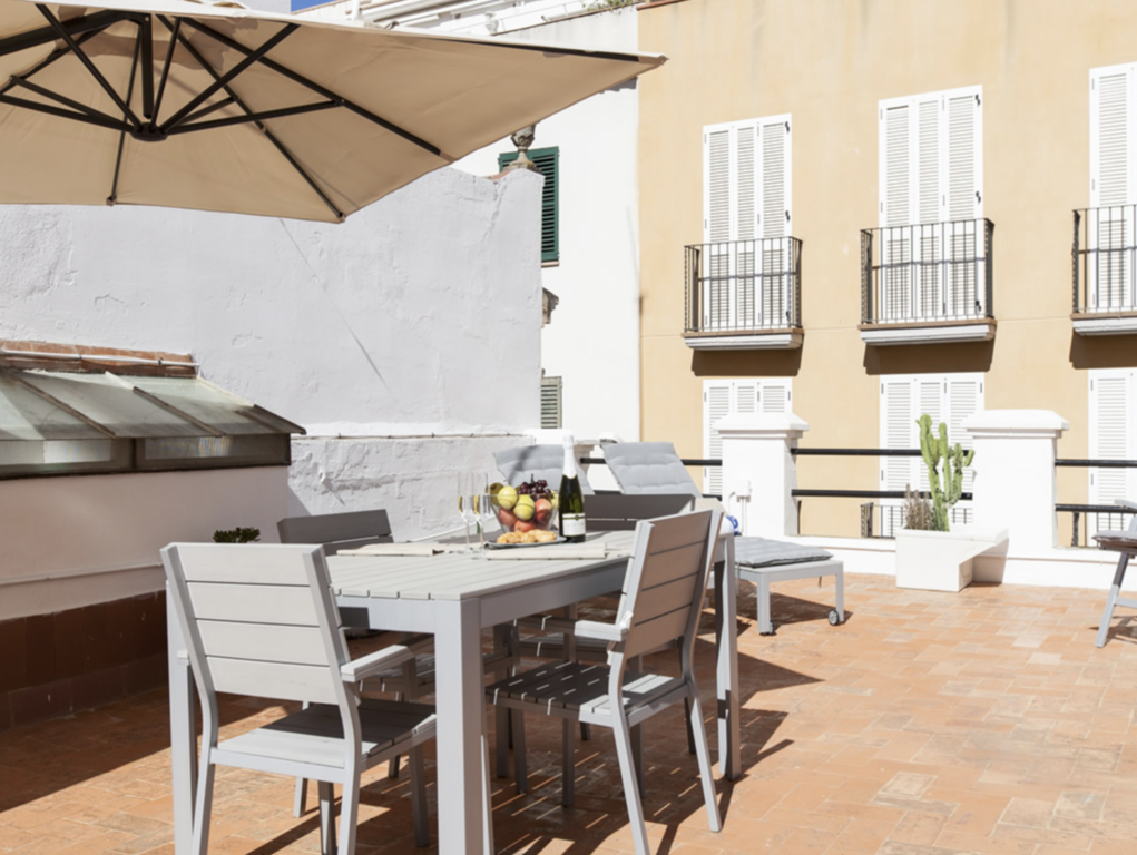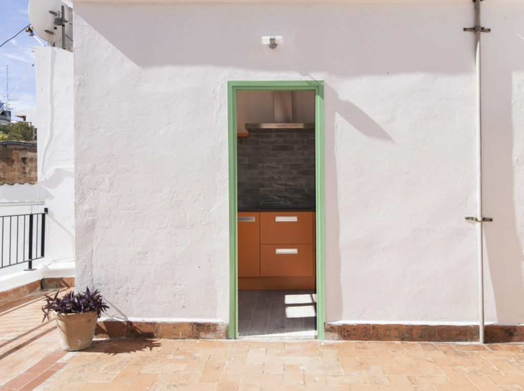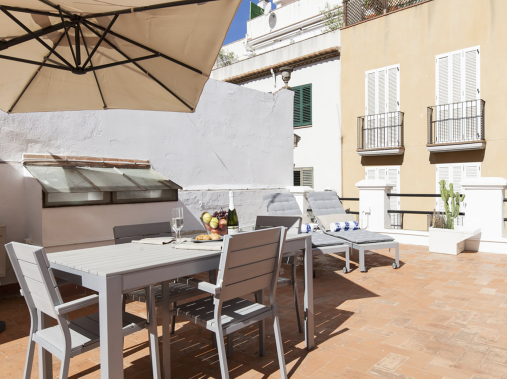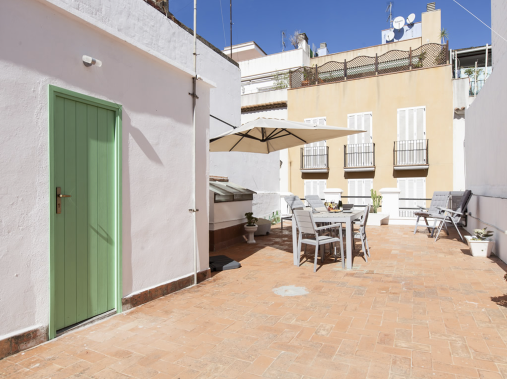 Authentic Sitges town house, located in Sitges centre. the property has been fully reformed but still holds much of its charm High ceilings and original Spanish floor tile, it is a very special property. On entering the house there is a long hall, off this there are the 2 bedrooms Bedroom one has 2 single beds and bedroom 2 has a double. Both bedrooms have air conditioning The bathroom fully reformed has a large walk in shower.There is a separate dining area which opens onto the living area with comfy seating and a flat screen TV, access to the large roof terrace is via a small conservatory with original double height French doors, here there is also a separate toilet. The living area has air conditioning. Double doors open into the modern kitchen equipped for your holiday needs. At the back of the property is the staircase which takes you up to a very large roof terrace , here you will find a separate kitchen outdoor dining table and chairs,also sunbeds.Parties on the roof terrace a strictly prohibited as there are private residences close by.