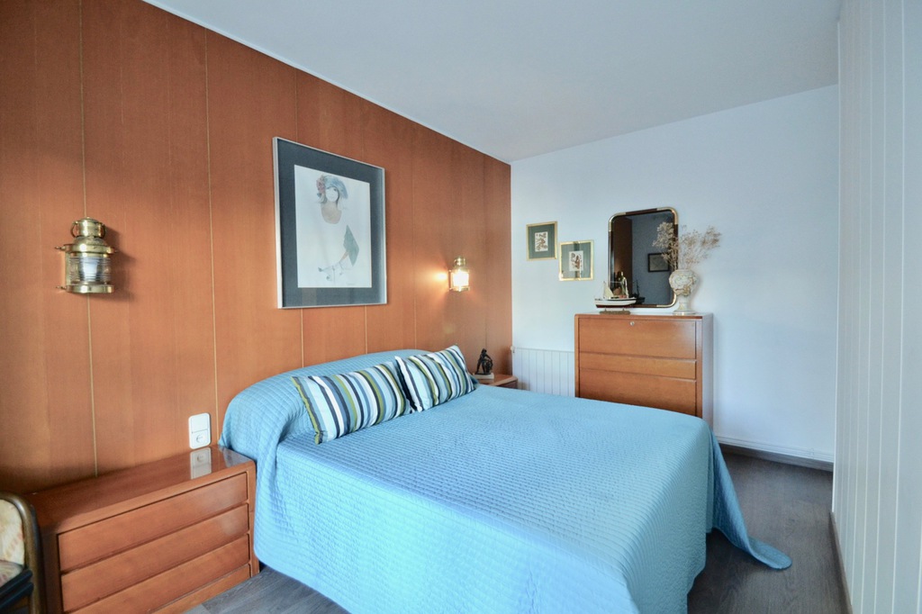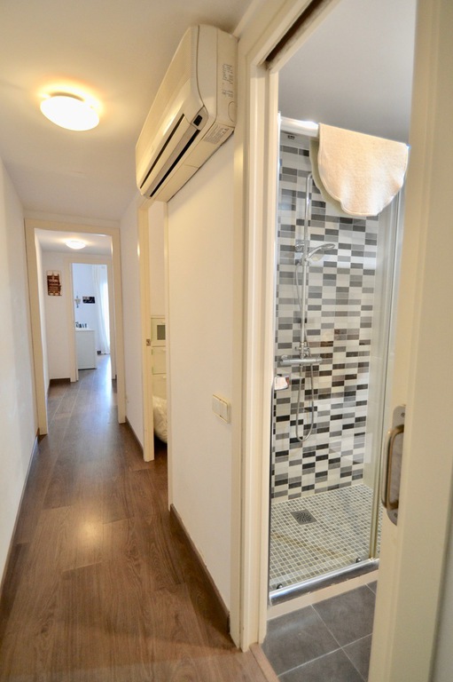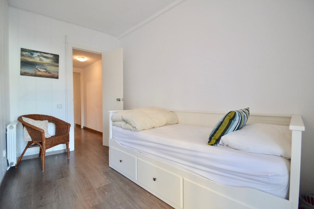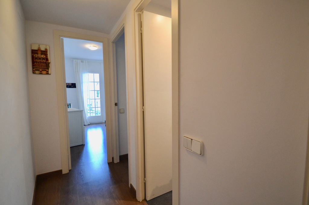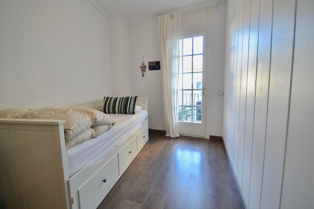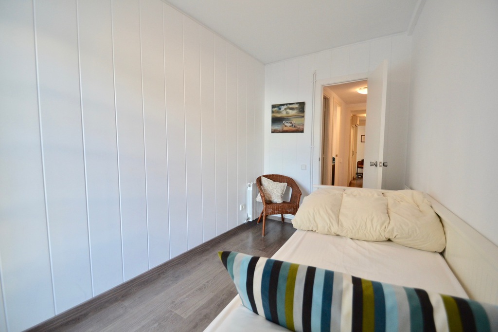 En la parte posterior del apartamento se encuentran los 3 dormitorios: el dormitorio principal tiene una cama king size, desde este dormitorio se accede al balcón trasero. El segundo dormitorio más pequeño tiene una cama individual con un sofá cama que se puede convertir en una doble. El tercer dormitorio tiene una cama individual, que se puede convertir en una doble desde esta habitación, también hay acceso al balcón trasero. Los dos baños se encuentran al lado de las habitaciones. El apartamento se encuentra en el primer piso y hay un ascensor. El apartamento tiene aire acondicionado, pero la brisa del mar lo mantiene fresco.