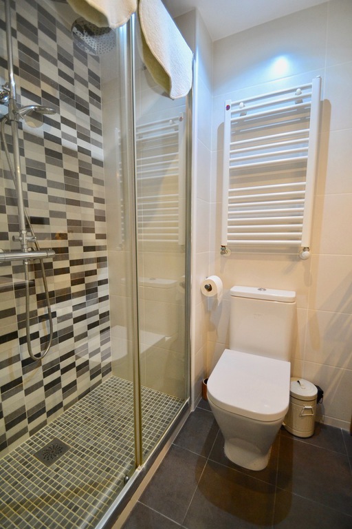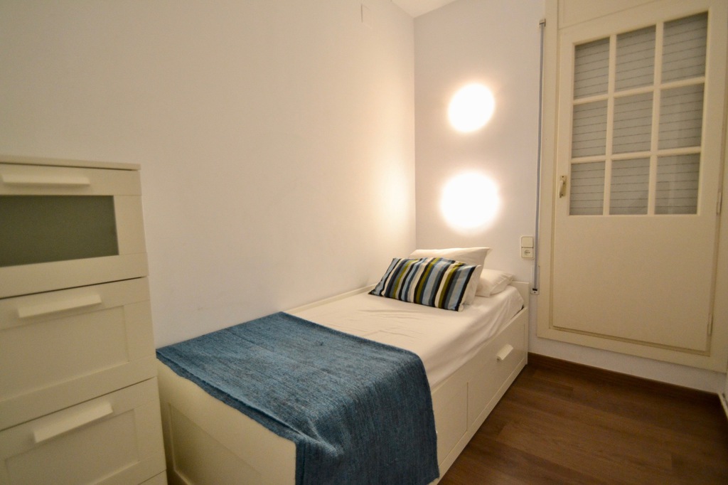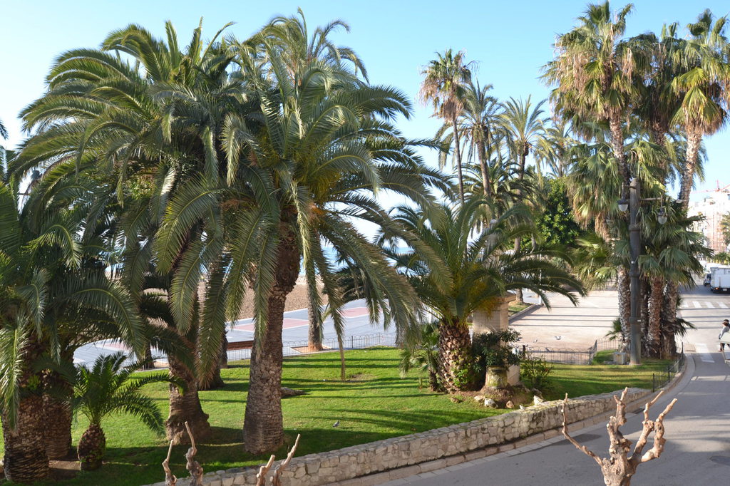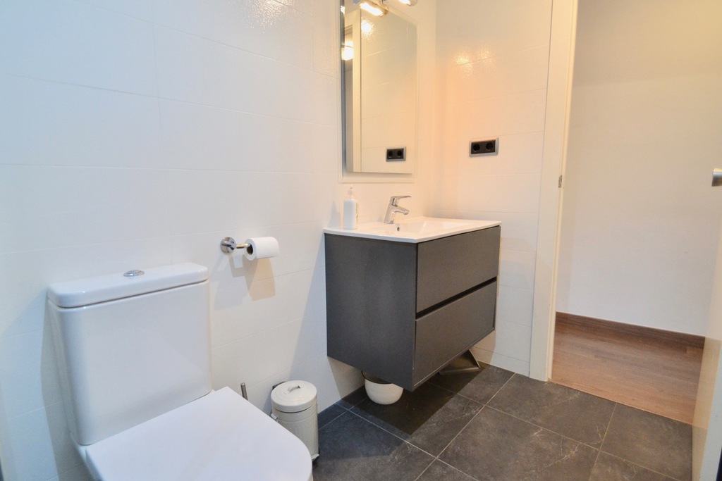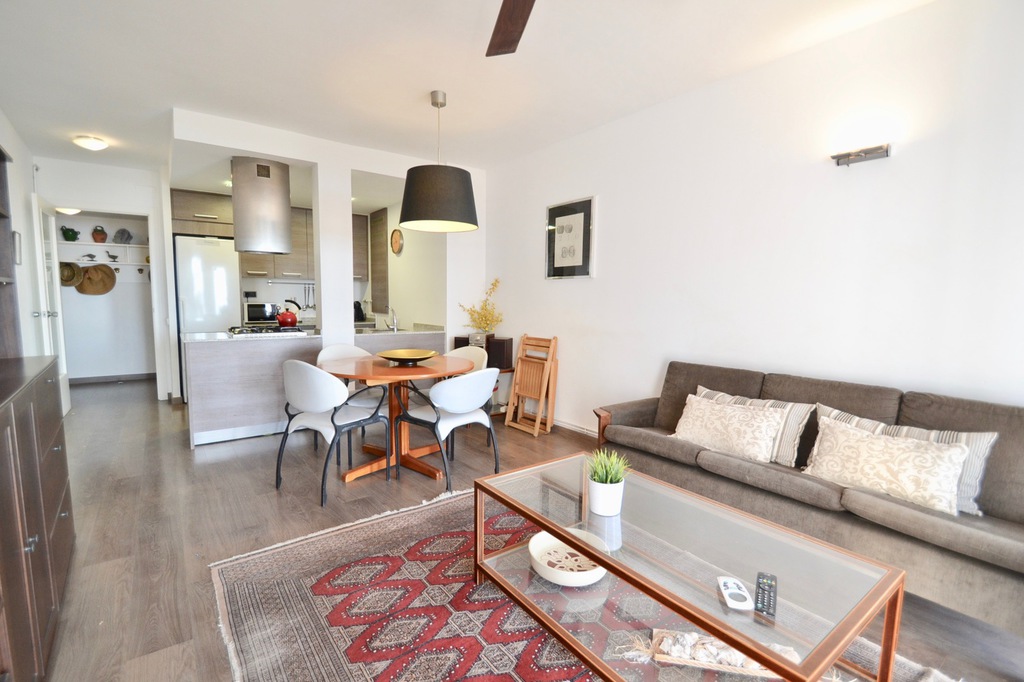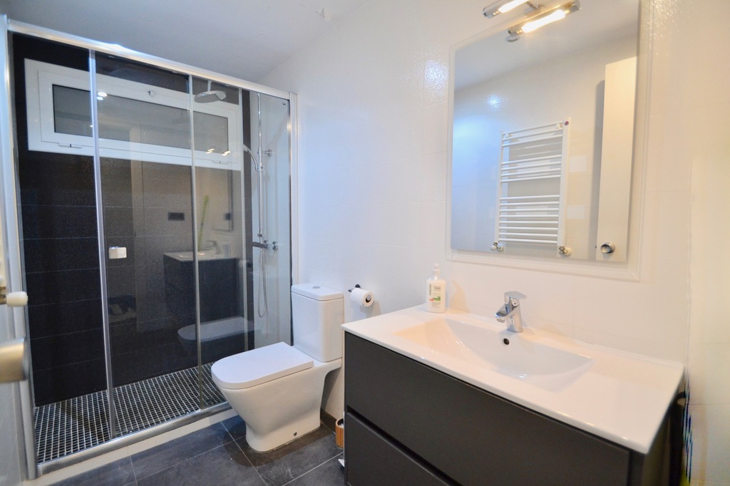 En la parte posterior del apartamento se encuentran los 3 dormitorios: el dormitorio principal tiene una cama king size, desde este dormitorio se accede al balcón trasero. El segundo dormitorio más pequeño tiene una cama individual con un sofá cama que se puede convertir en una doble. El tercer dormitorio tiene una cama individual, que se puede convertir en una doble desde esta habitación, también hay acceso al balcón trasero. Los dos baños se encuentran al lado de las habitaciones. El apartamento se encuentra en el primer piso y hay un ascensor. El apartamento tiene aire acondicionado, pero la brisa del mar lo mantiene fresco.
