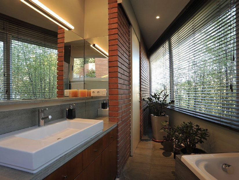plan and the hallway leads to a large bedroom, guest toilet and a service room with a utility room. The second and top floor of the house accommodates a bathroom, 2 double bedrooms and a large