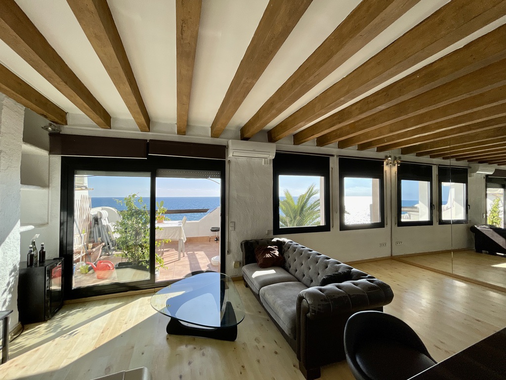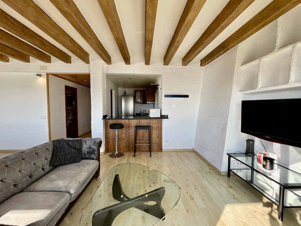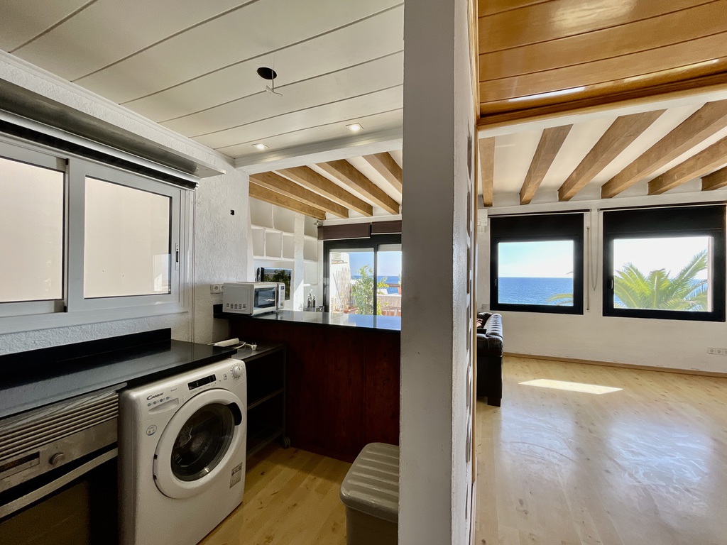 La amplia sala de estar con vistas al mar se combina con una cocina americana completamente equipada, creando un espacio moderno y práctico. El apartamento ha sido completamente renovado con un estilo contemporáneo.